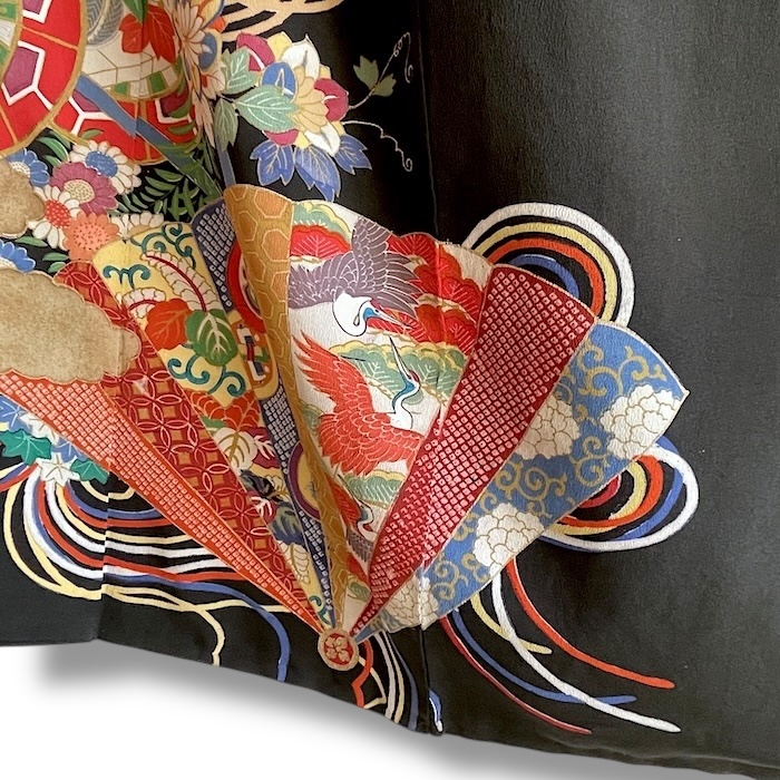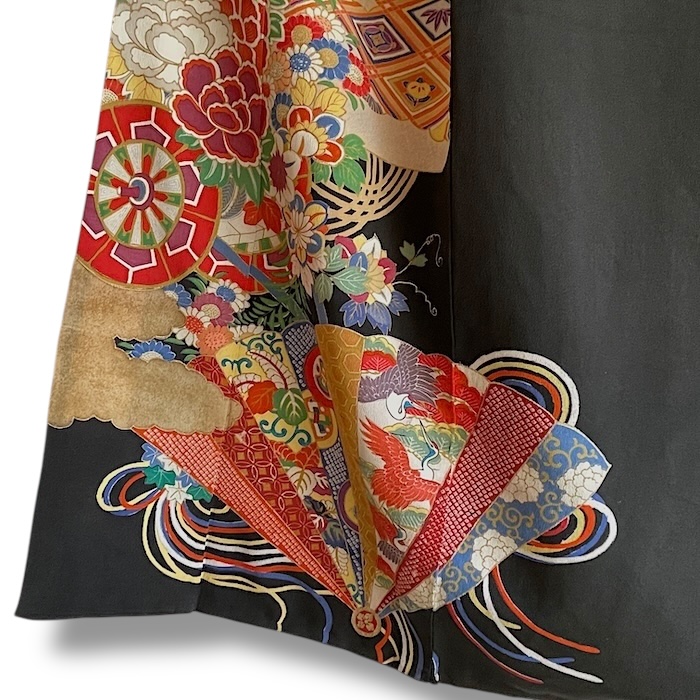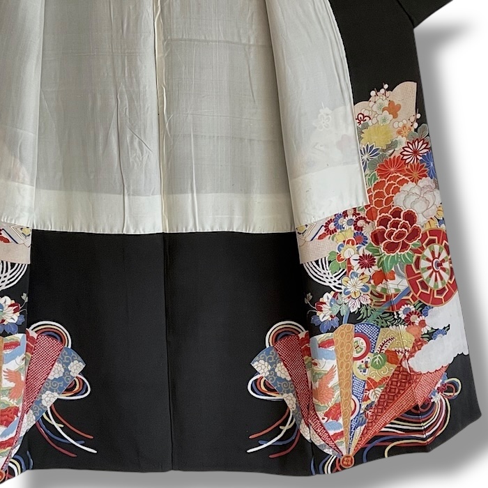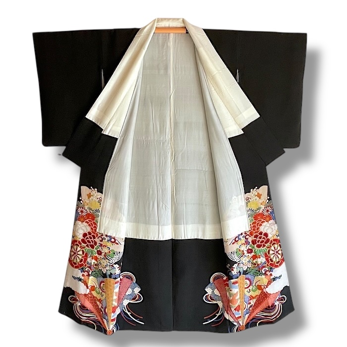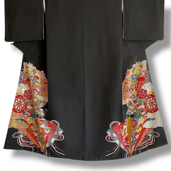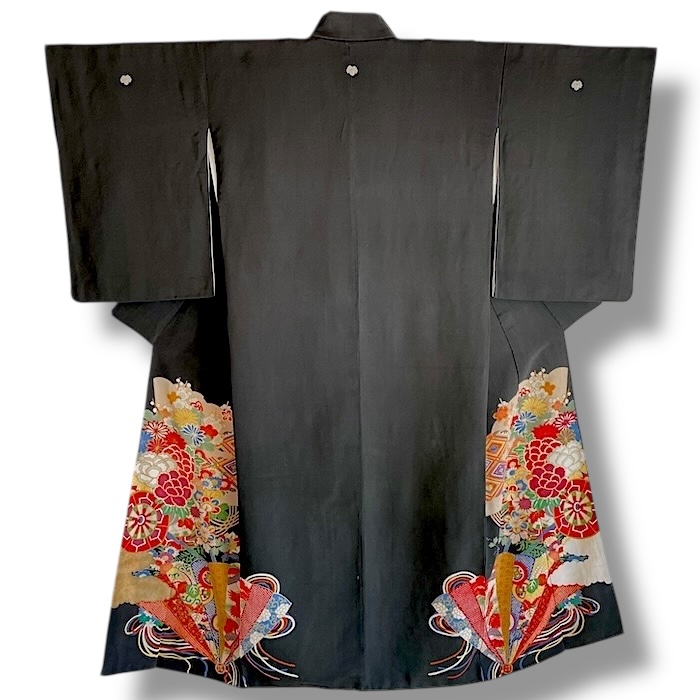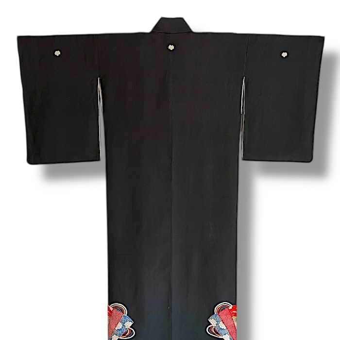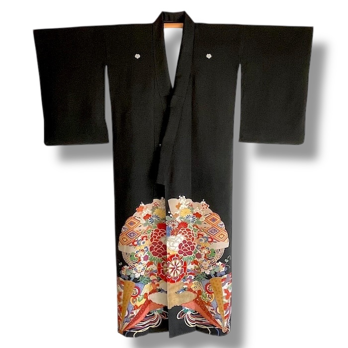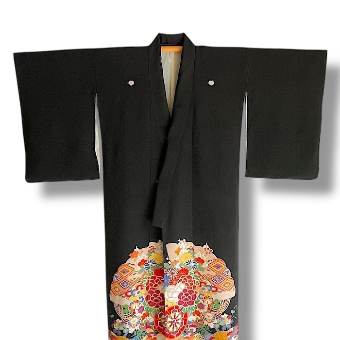 Ce kimono noir vintage de type kuro-tomesode (début 20e) en soie chirimen dans un tissage fin, est rehaussé de 5 kamon (blasons) et entièrement doublé. Ces kimonos étaient portés par les femmes mariées et restaient réservés aux cérémonies et aux événements exceptionnels. La couleur noire typique de ce style met en valeur les magnifiques motifs colorés et symboliques concentrés sur la partie basse créant ainsi un contraste saisissant. La disposition des motifs est légèrement différente des tomesode contemporains: ainsi, les motifs principaux ornent toujours le devant du kimono avec une profusion de couleurs et de motifs qui montent assez haut, mais la partie inférieure du dos est très  sobre. Les couleurs ont ici gardé  leur éclat et leur fraîcheur au-delà du temps.