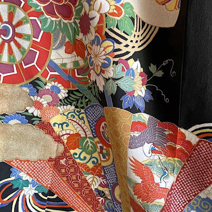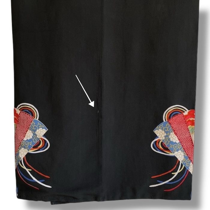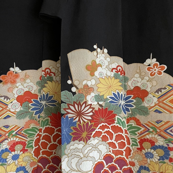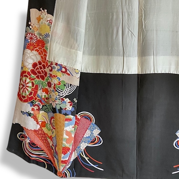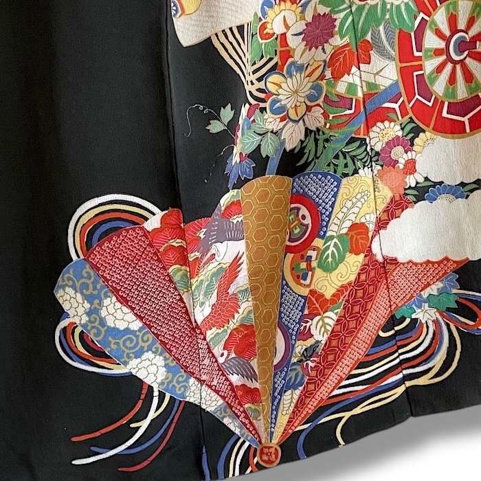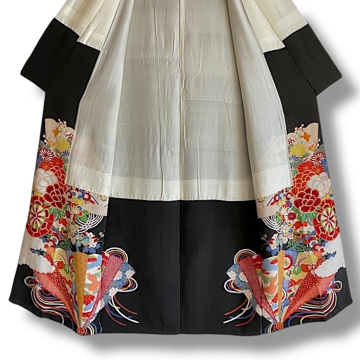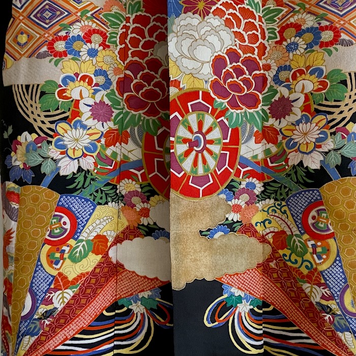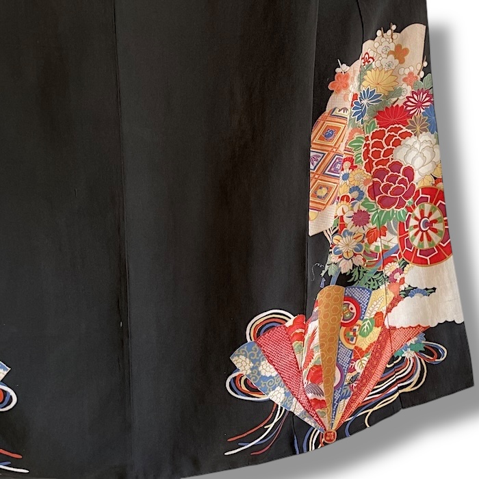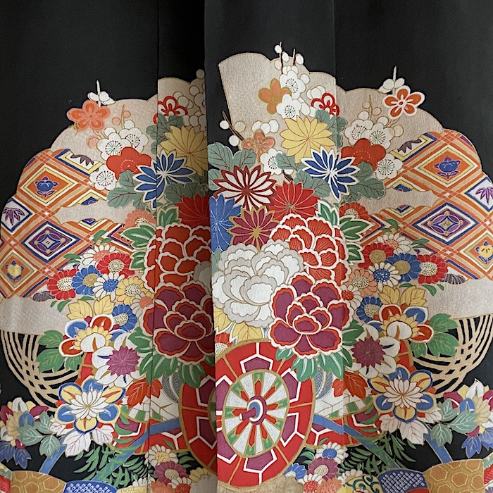 Ce kimono noir vintage de type kuro-tomesode (début 20e) en soie chirimen dans un tissage fin, est rehaussé de 5 kamon (blasons) et entièrement doublé. Ces kimonos étaient portés par les femmes mariées et restaient réservés aux cérémonies et aux événements exceptionnels. La couleur noire typique de ce style met en valeur les magnifiques motifs colorés et symboliques concentrés sur la partie basse créant ainsi un contraste saisissant. La disposition des motifs est légèrement différente des tomesode contemporains: ainsi, les motifs principaux ornent toujours le devant du kimono avec une profusion de couleurs et de motifs qui montent assez haut, mais la partie inférieure du dos est très  sobre. Les couleurs ont ici gardé  leur éclat et leur fraîcheur au-delà du temps.