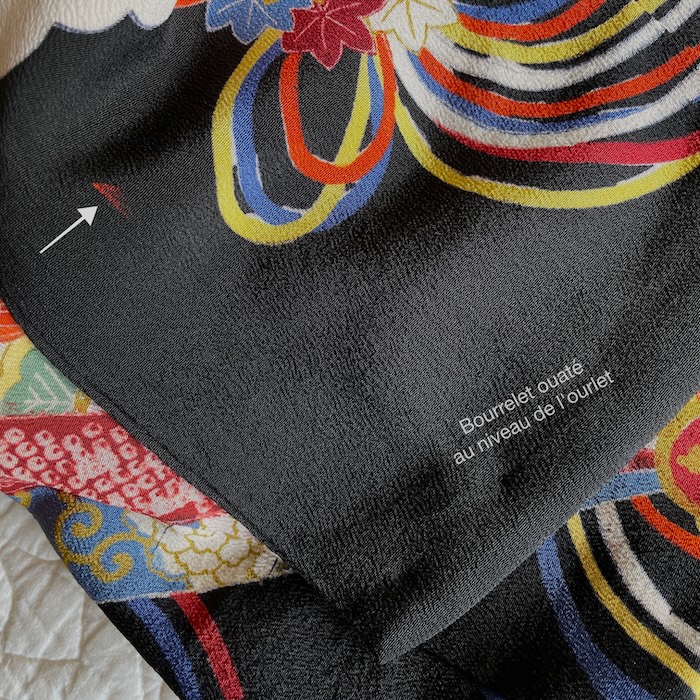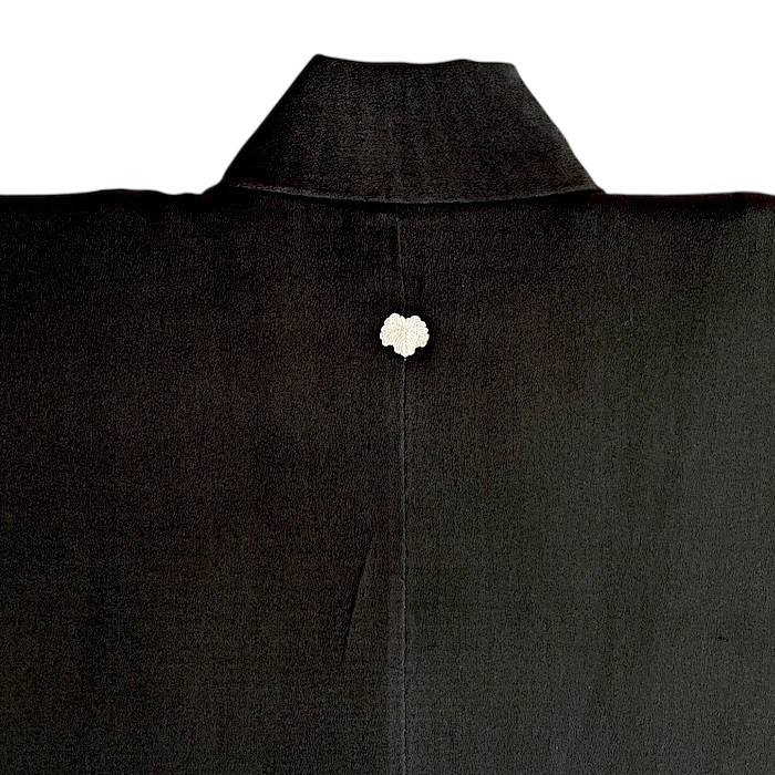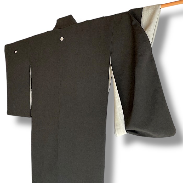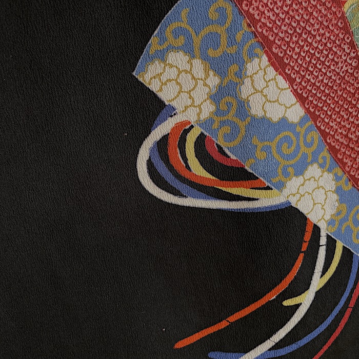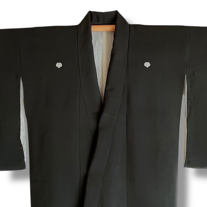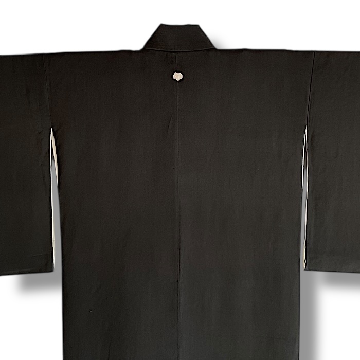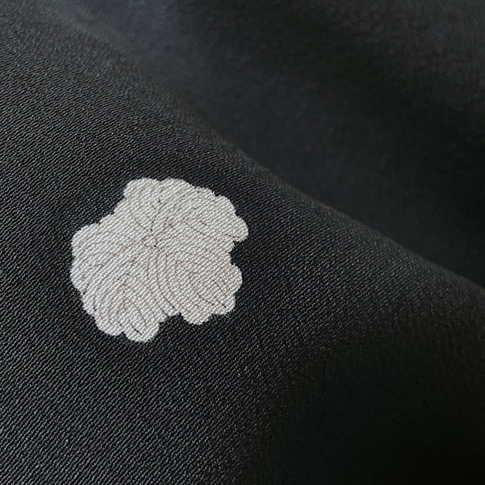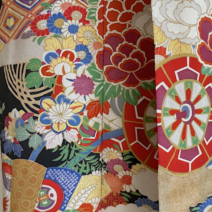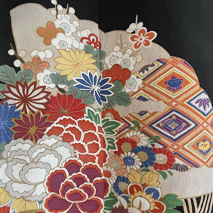 Ce kimono noir vintage de type kuro-tomesode (début 20e) en soie chirimen dans un tissage fin, est rehaussé de 5 kamon (blasons) et entièrement doublé. Ces kimonos étaient portés par les femmes mariées et restaient réservés aux cérémonies et aux événements exceptionnels. La couleur noire typique de ce style met en valeur les magnifiques motifs colorés et symboliques concentrés sur la partie basse créant ainsi un contraste saisissant. La disposition des motifs est légèrement différente des tomesode contemporains: ainsi, les motifs principaux ornent toujours le devant du kimono avec une profusion de couleurs et de motifs qui montent assez haut, mais la partie inférieure du dos est très  sobre. Les couleurs ont ici gardé  leur éclat et leur fraîcheur au-delà du temps.