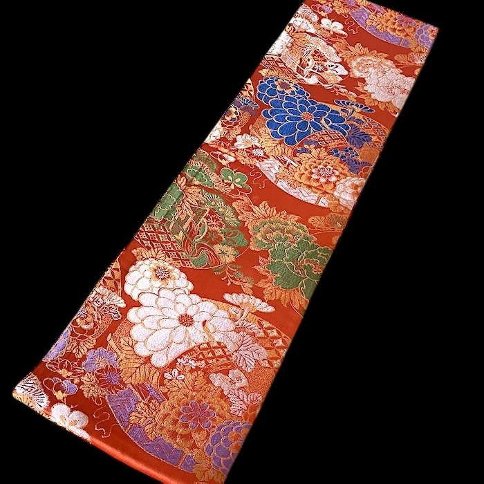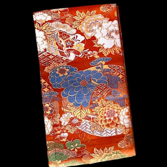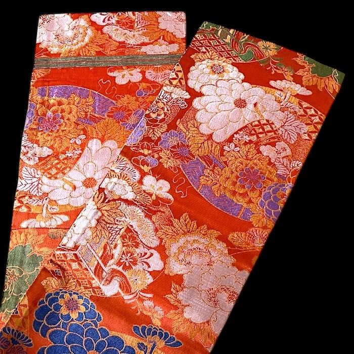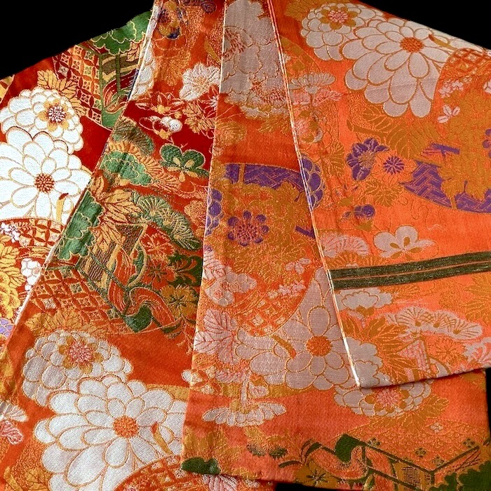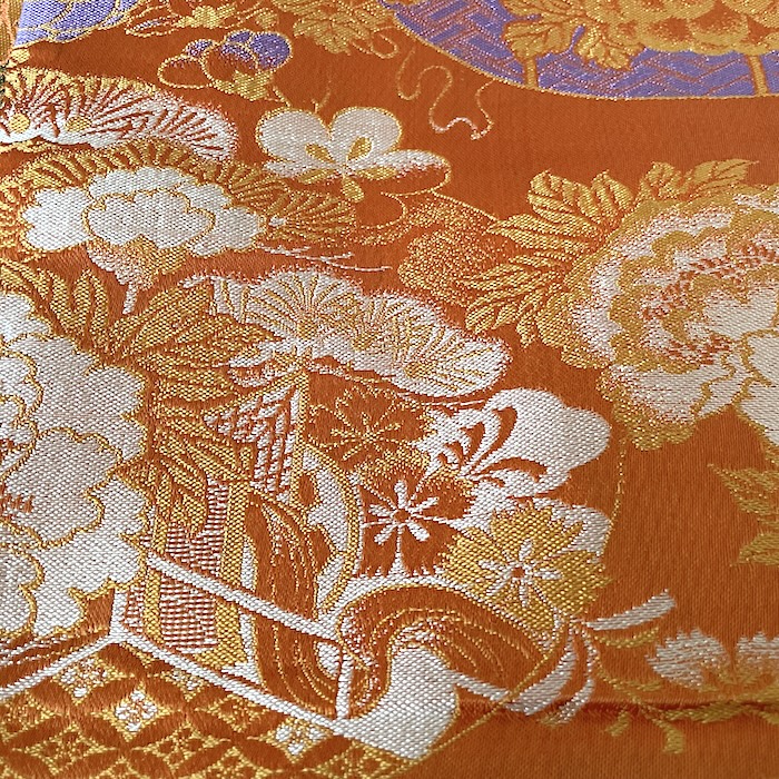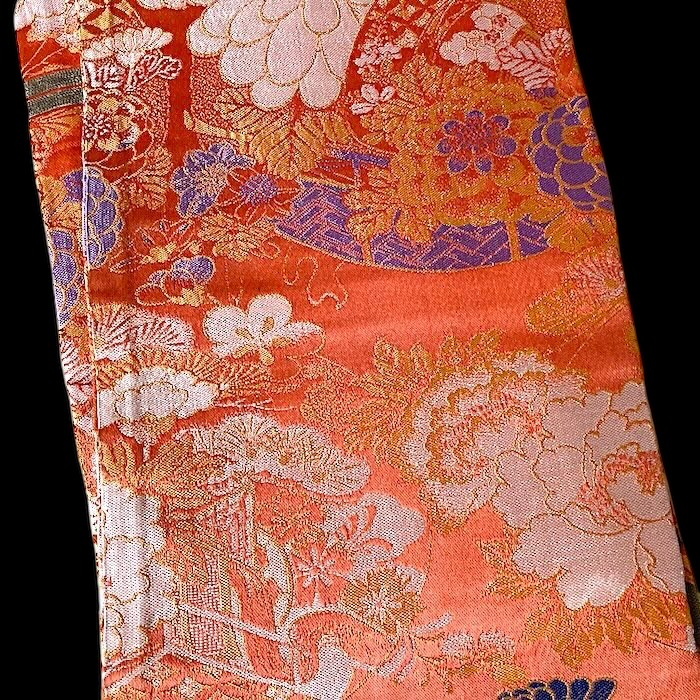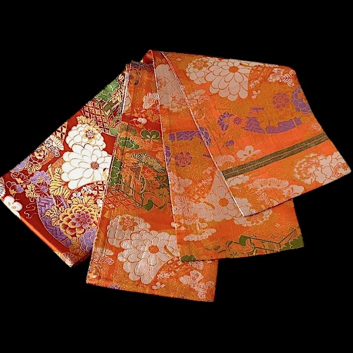 OFFERT: obi ancien en soie, doublé. Fond orangé vif associé à de nombreux motifs tissés colorés (pivoines, chrysanthèmes, oeillets, pins, fleurs de pruniers, flore automnale, chariots réservés à la noblesse...). Très bon état.