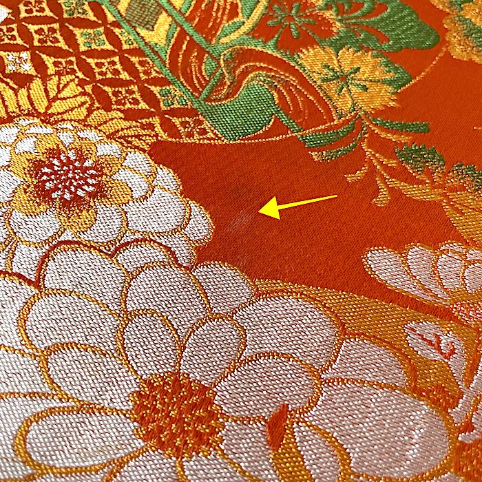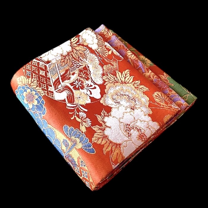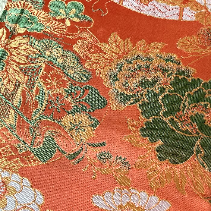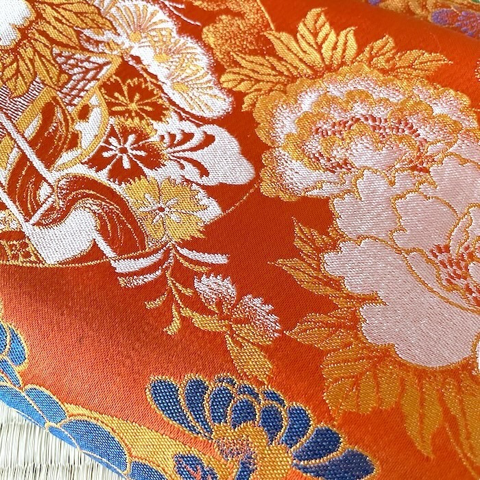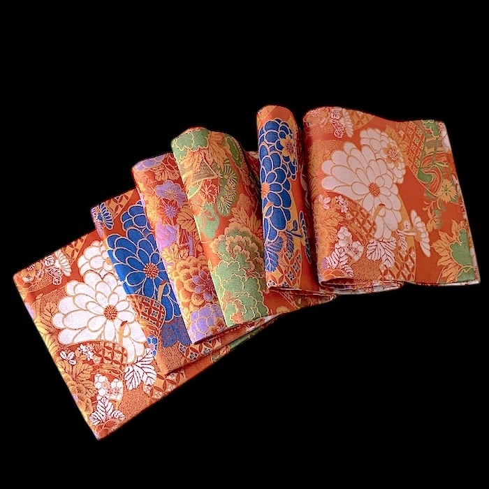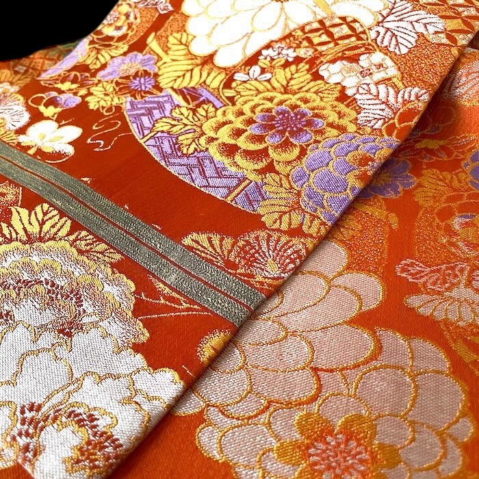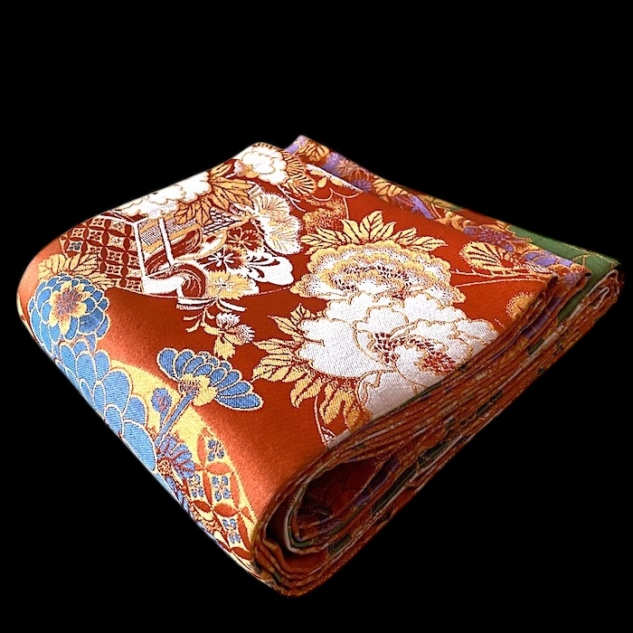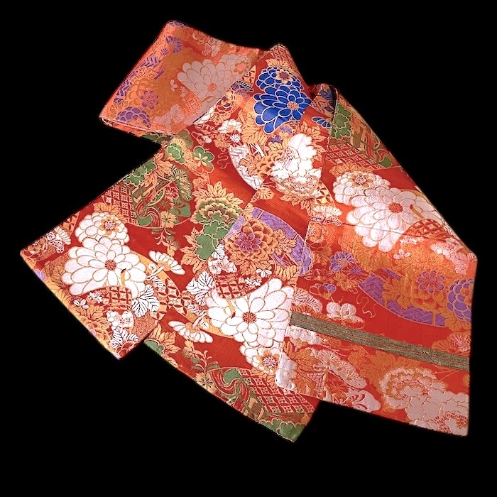 OFFERT: obi ancien en soie, doublé. Fond orangé vif associé à de nombreux motifs tissés colorés (pivoines, chrysanthèmes, oeillets, pins, fleurs de pruniers, flore automnale, chariots réservés à la noblesse...). Très bon état.