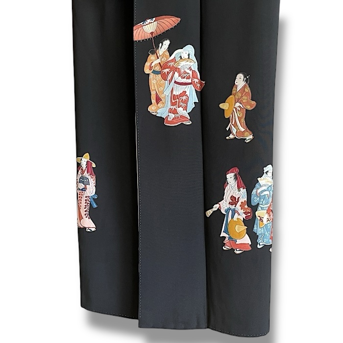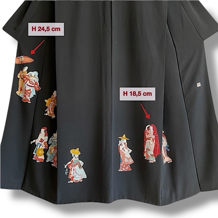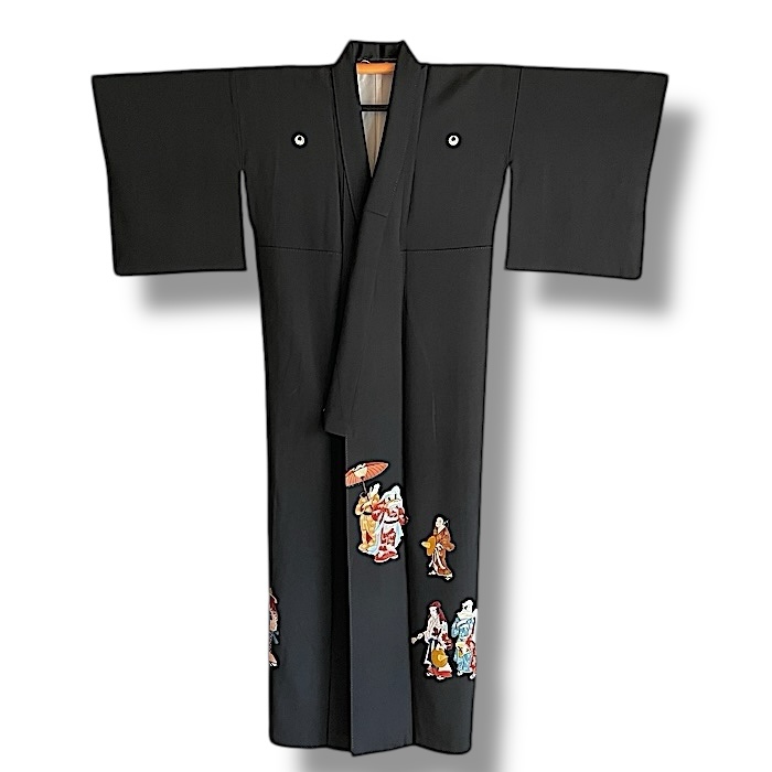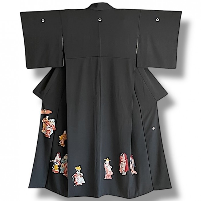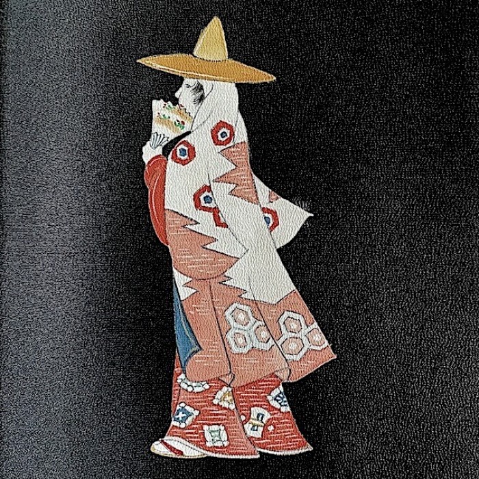 Ce kimono tout à fait original arbore un motif exceptionnel et très rare. Ici, pas de flore foisonnante ni d'abondants symboles auspicieux mais des personnages qui semblent se suivre et se diriger vers une destination commune dans un décor minimaliste. Toutefois, en y regardant de plus près, il est permis d'imaginer que ces femmes, probablement issue de la riche classe marchande au vu leurs luxueux kimonos, accompagnées de servantes se sont réunies pour aller à la chasse aux lucioles (hotaru). Nous sommes au début de la période d'Edo (17e), et pour sortir, les femmes ont l'habitude de porter des coiffes diverses avec un deuxième kimono (kadzuki) porté par-dessus leur tête pour se protéger ou ne pas être reconnues.