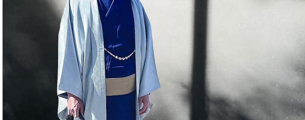 Cérémonie du thé, sadôHaori en soie de type tsumugi bleu nuit, finement strié, visible de près..
