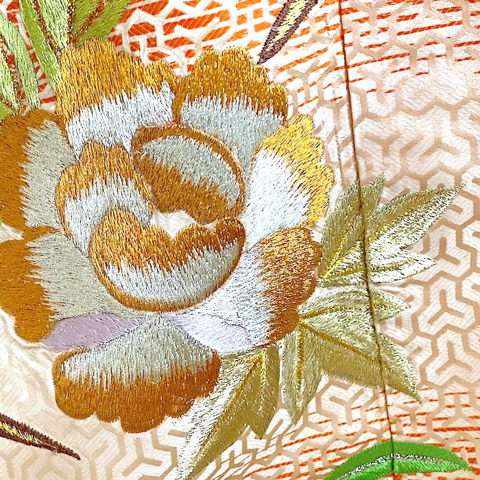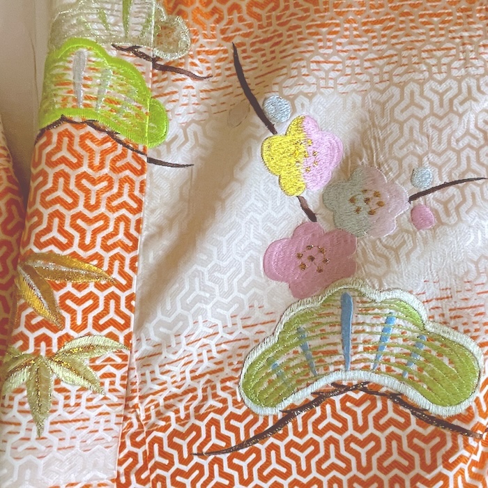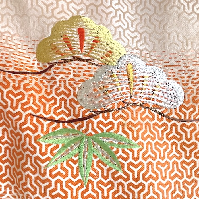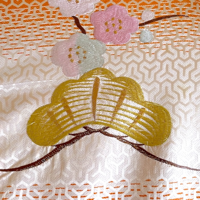 De jeunes pins (immortalité et résistance), des fleurs de prunier, des feuilles de bambou et des pivoines (reines des fleurs) somptueusement brodés sont disposés sur les manches et le haut du kimono.