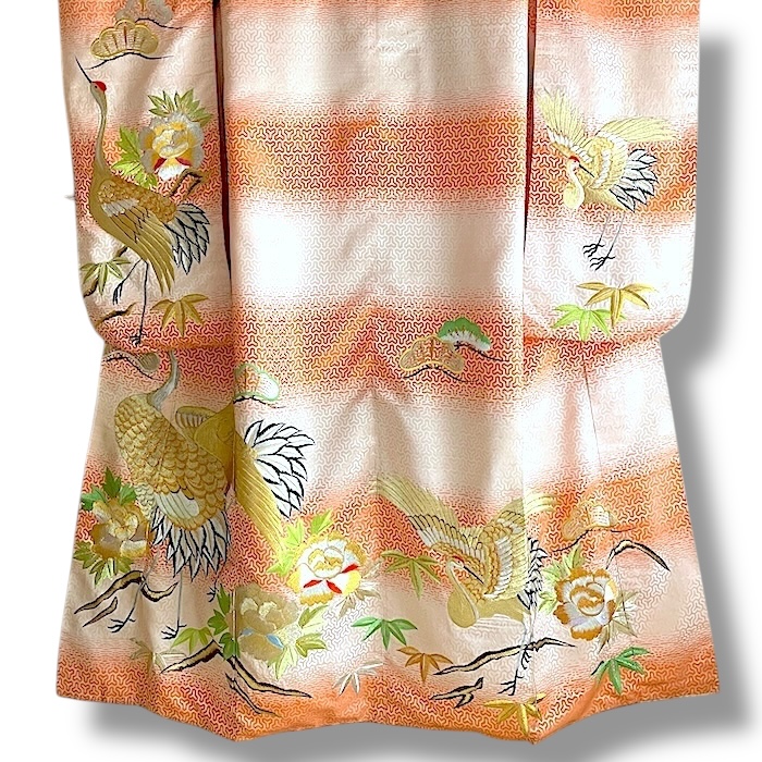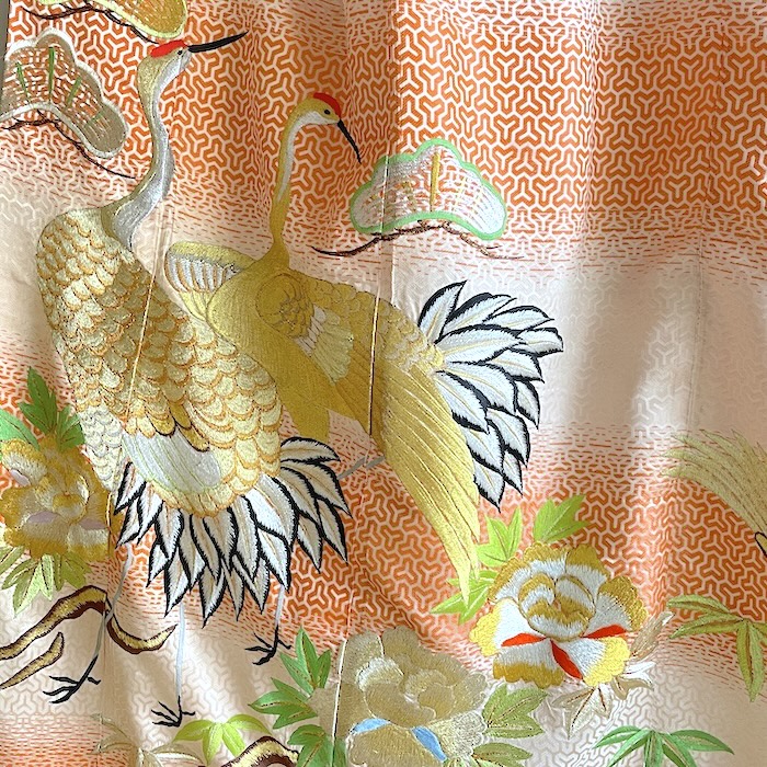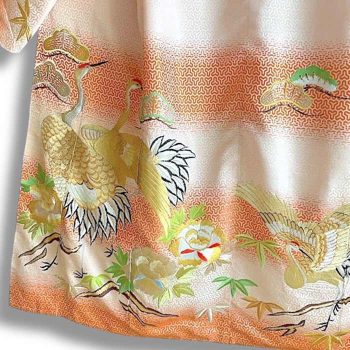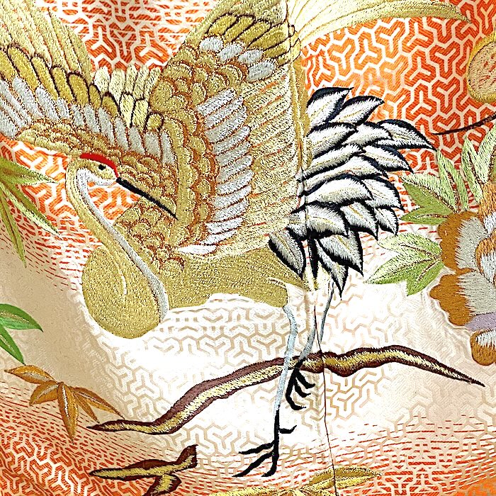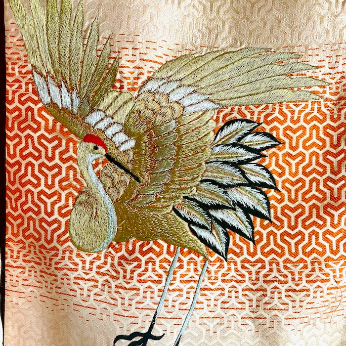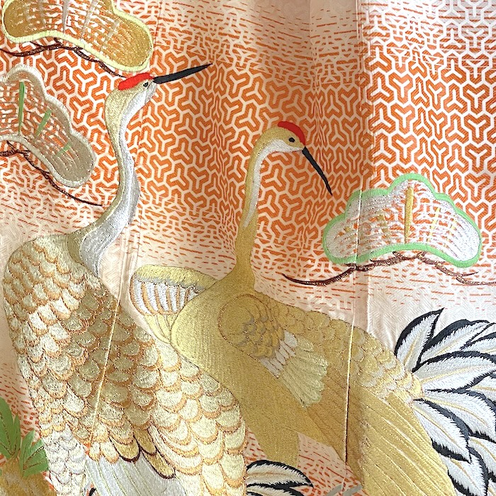 Ce kakeshita est surtout remarquable par la présence de magnifiques et imposantes broderies en soie et fil doré et argenté. Le bas du kimono et des manches est orné de graciles grues blanches au long cou, animaux spirituels qui font le lien entre les dieux et les vivants, qui symbolisent longévité et fidélité dans le couple car une fois réunies, elles le restent pour la vie. C'est la raison pour laquelle, elles sont souvent présentes sur les kimonos de mariage ou de nouvel an.