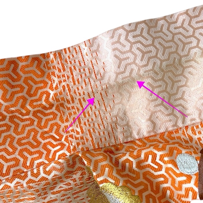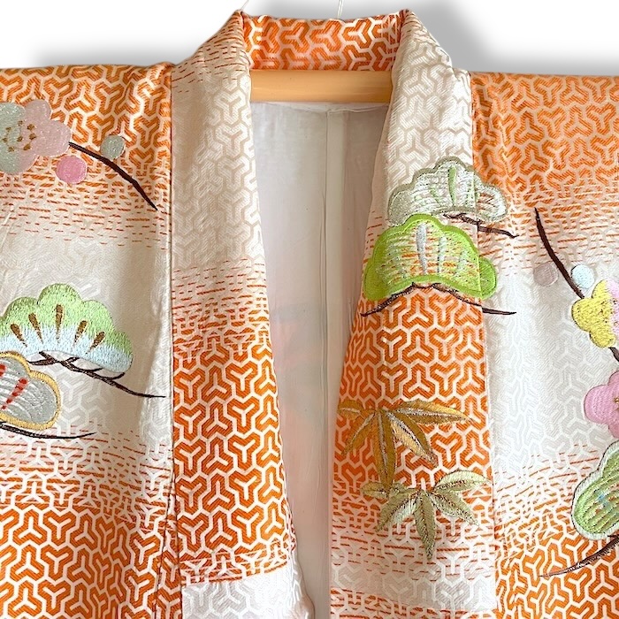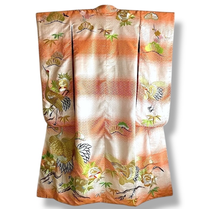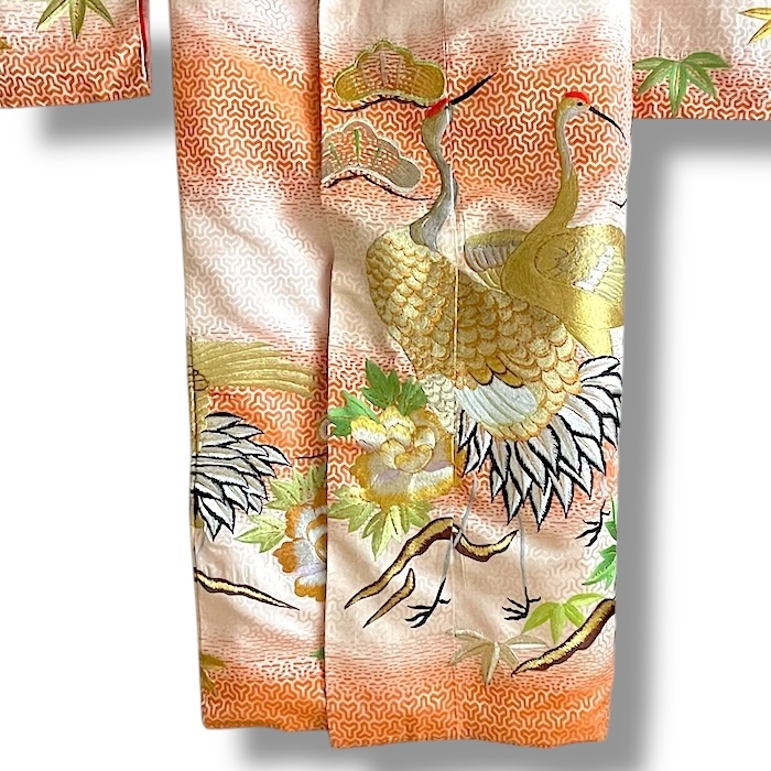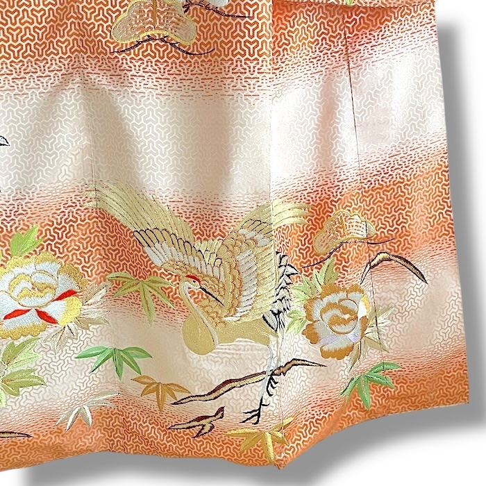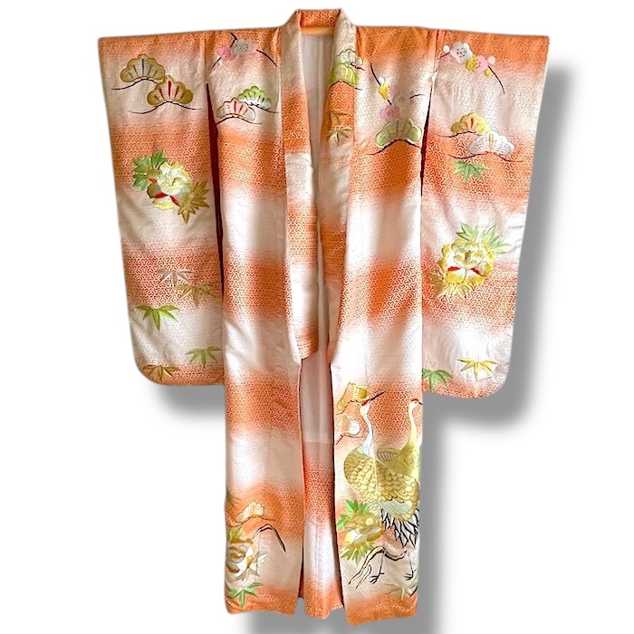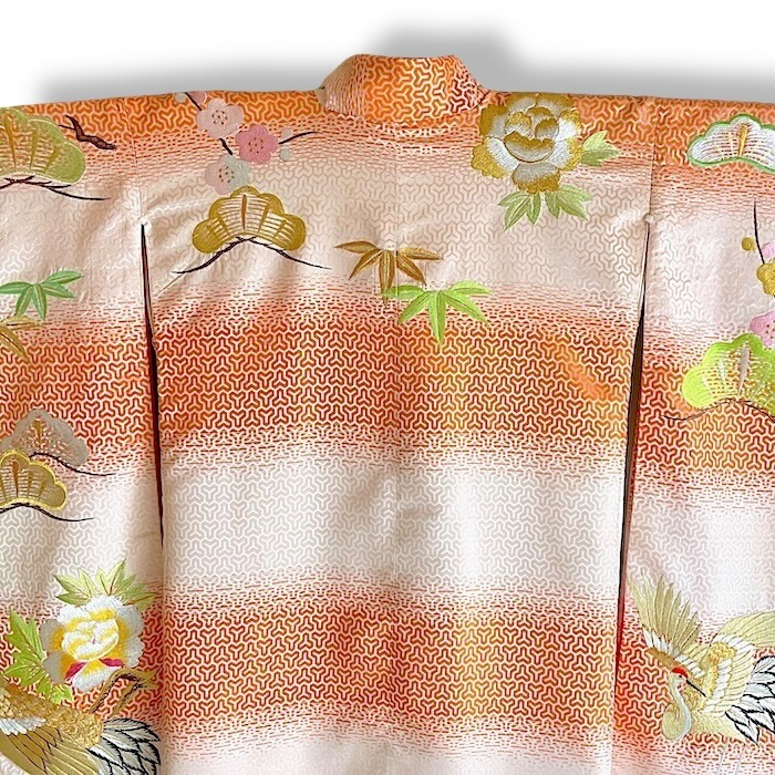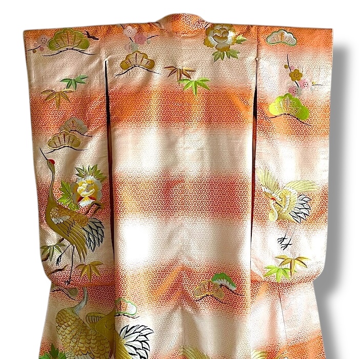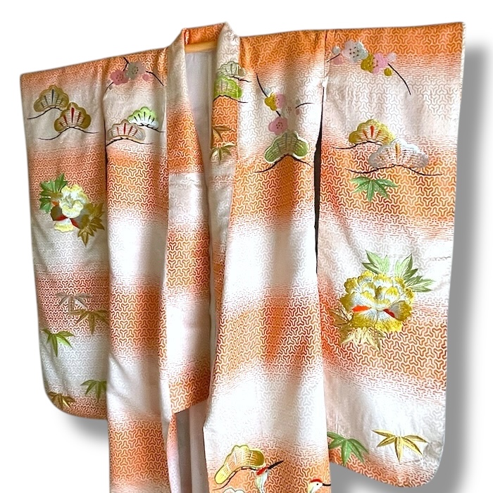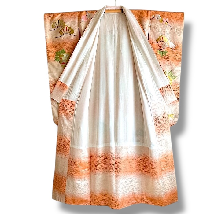 Kakeshita ancien, en soie orné de nombreuses broderies colorées,dorées et argentées, symboliques et thématiques, sur un fond en dégradé orangé et blanc nuancé disposé en large rayures qui souligne l'aspect festif et sophistiqué du kimono. Ce petit motif géométrique et répétitif tissé sur le fond est appelé "bishamon-kikkou", d'après le personnage Bishamonten, une divinité bouddhiste qui appartient au royaume céleste et qui portait généralement une armure ornée d'un motif répété de trois hexagones joints pour former un Y. Bishamonten est également un des sept dieux de la bonne fortune qui confère diverses vertus. Motif chinois à l'origine, il a été japonisé pendant la période Heian (10e s.) et très apprécié pour son effet raffiné et digne et ses connotations auspicieuses de longévité. Le motif était fréquemment utilisé pour les vêtements de cour, et plus tard pour les kimonos et les armures des guerriers.