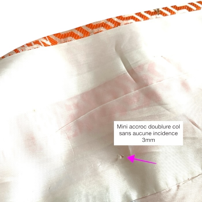 Légères traces de pliure sur le col. Petit accroc sur la doublure du col sans incidence..