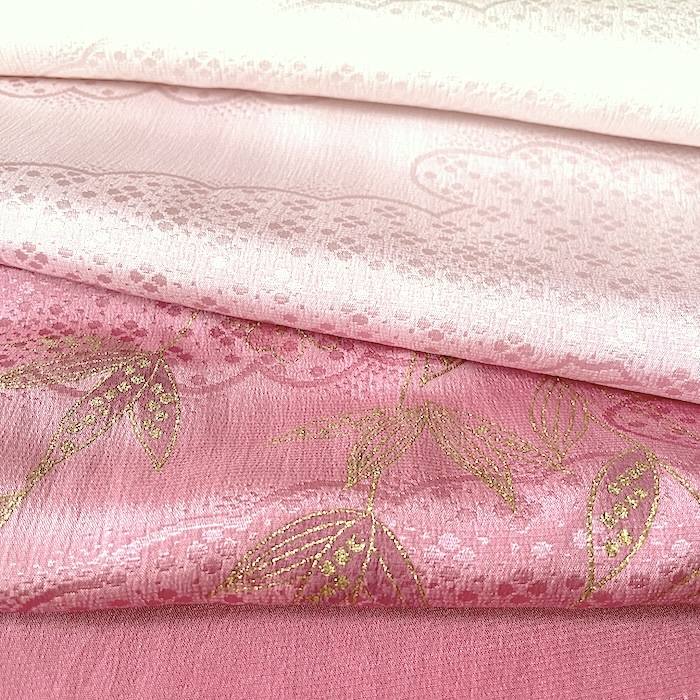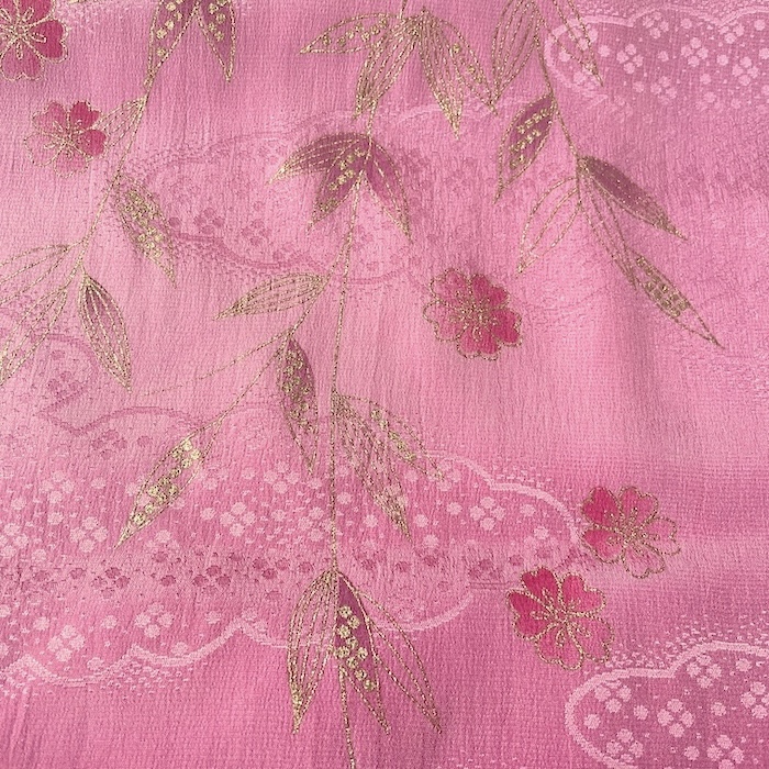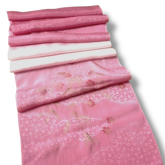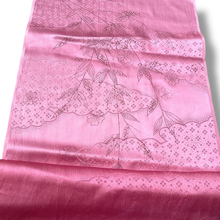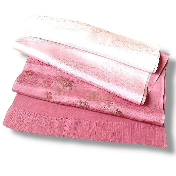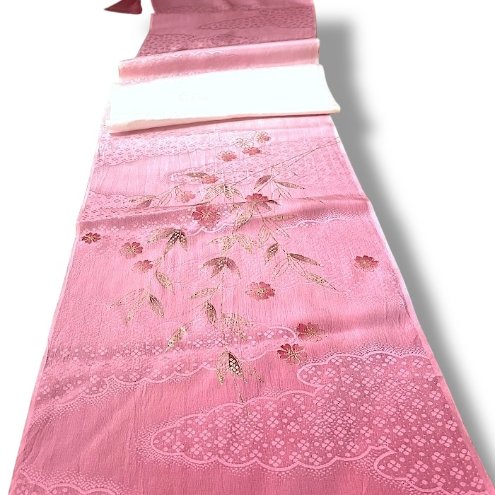 Obiage en soie fine, tissé de formes en nuages, toujours de bon augure, et orné de branches de cerisier pleureur en fleur sur un côté. Sur l'endroit, feuillage et fleurs sont rehaussés de contours dorés finement appliqués sur un fond rose-violine en dégradés qui apparait plus ou moins clair selon la lumière. Le milieu du obiage (partie placée dans le dos) est blanc.