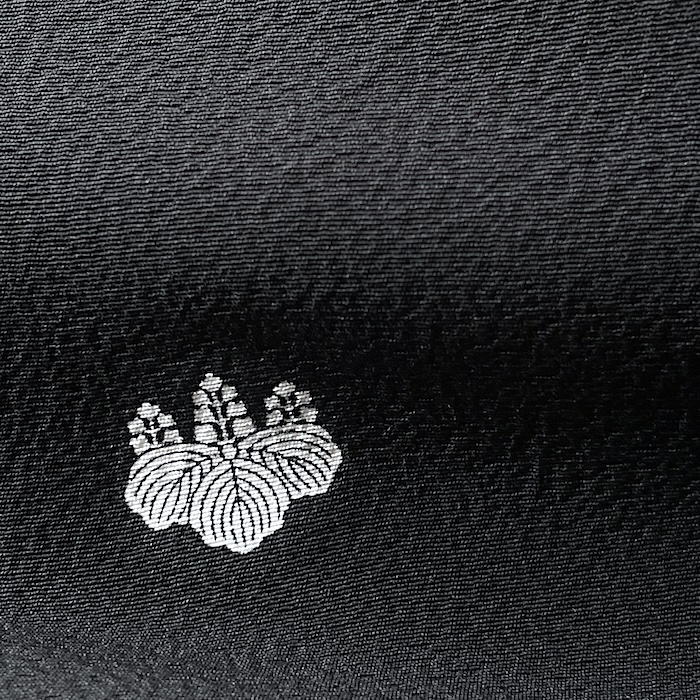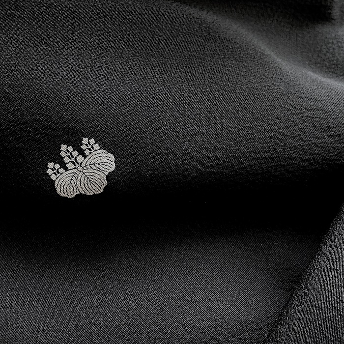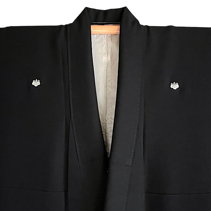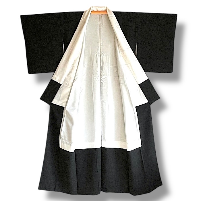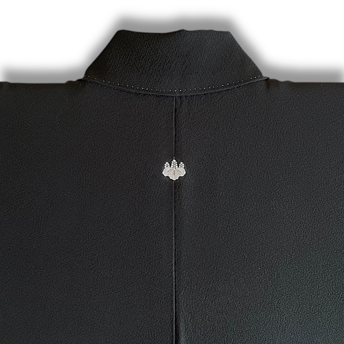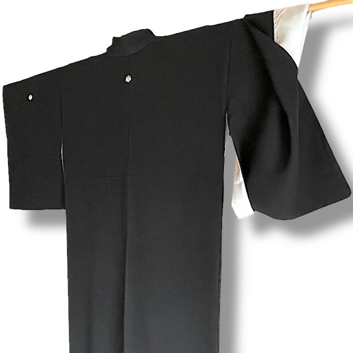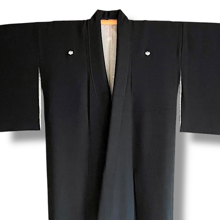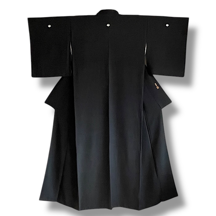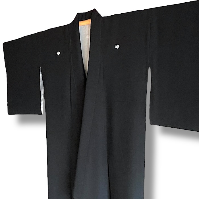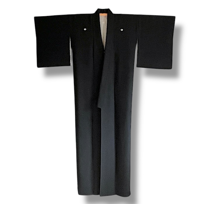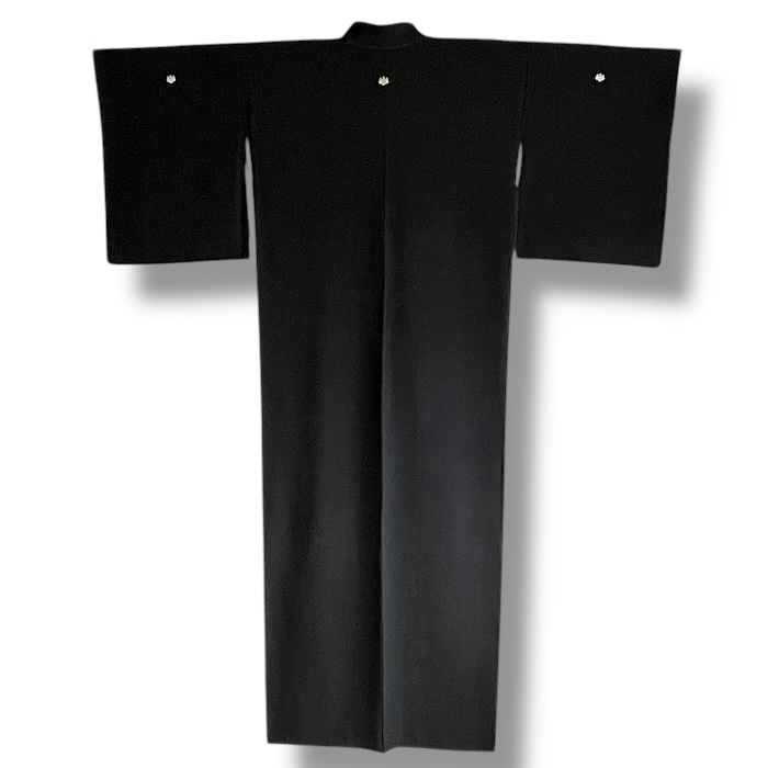 Kimono noir mat en soie de type chirimen, doublé, orné de 5 kamon qui en font un kimono officiel, porté traditionnellement à l'occasion de funérailles ou d'événements particuliers. Les kamon peuvent être choisis librement si celui de la famille n'est pas connu. Cette tenue a été peu à peu remplacée par des tenues de deuil occidentales, plus pratiques, discrètes et confortables pour les personnes peu habituées à porter le kimono. Vous pourrez toutefois agrémenter ce kimono à votre goût avec un obi et des accessoires colorés. Ce tissu est particulièrement adapté et prisé par les fans de kimonos car il tombe parfaitement, ne se froisse pas facilement et est agréable à porter. Excellent état de l'ensemble. Très long.